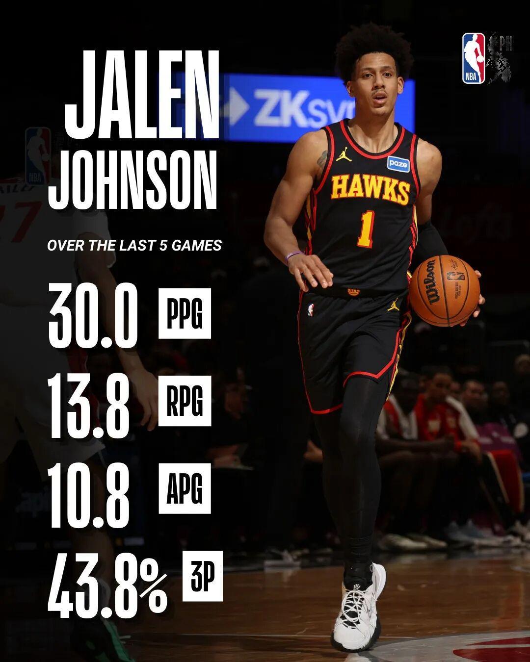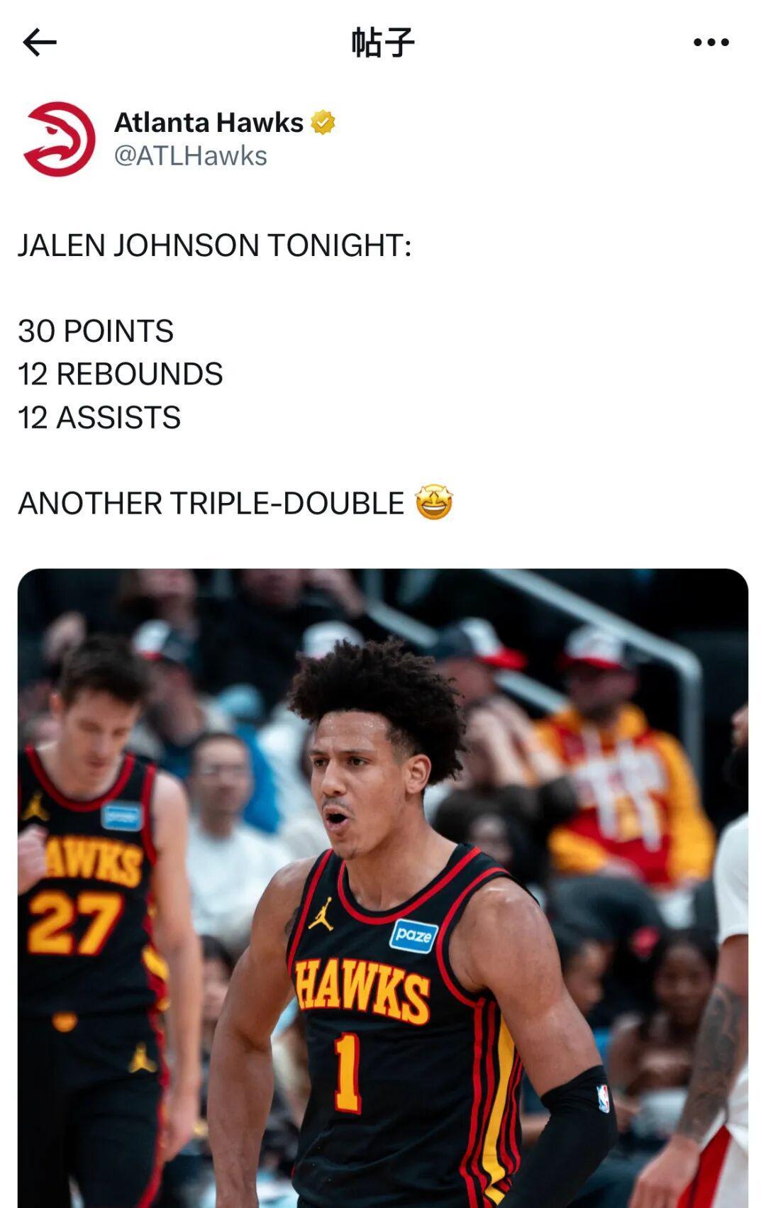 需要说的是,这已经是杰伦约翰逊连续第二场拿下三双了,这场比赛结束前不到24小时,他刚刚在面对掘金的比赛里得到21分18篮板16助攻。
